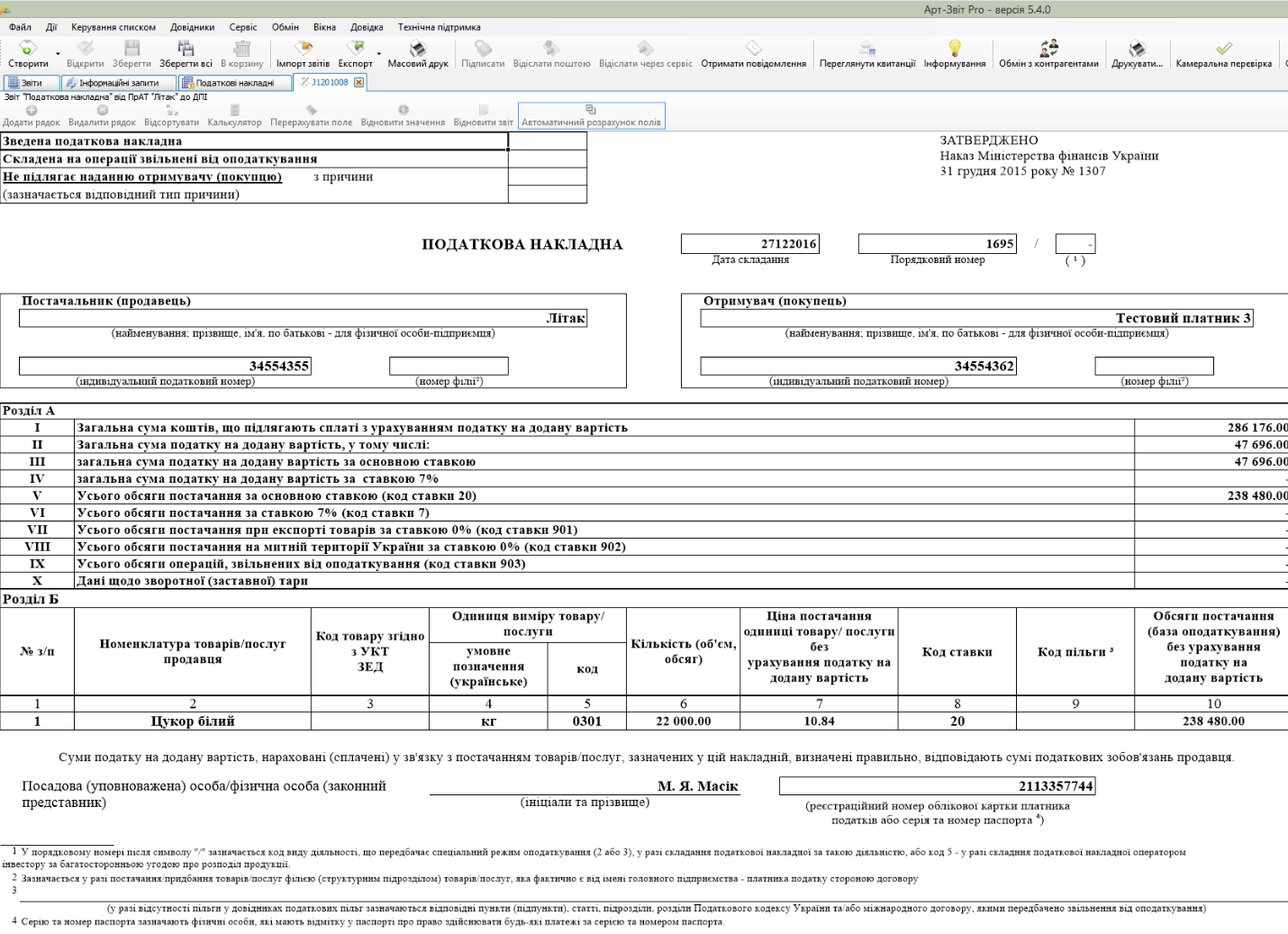 Зауважимо, що первинні документи, підписані в програмі Арт-Звіт Pro, є юридично значущими, їх довгострокове архівне зберігання забезпечується використанням розширеного підпису в форматі CAdES-X Long (CMS Advanced Electronic Signatures).
